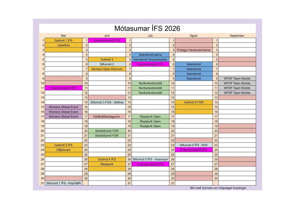 Nú liggur fyrir mótaskrá ÍFS fyrir komandi keppnistímabil og er þar að finna fjölbreytt úrval móta fyrir mismunandi getuhópa. Gullmótaröðin er ætluð þeim bestu en Silfurmótaröðin fyrir þá sem eru að byrja í keppnum og vilja auðveldari mót. EInnig er boðið upp á sérstaka kvennamótaröð þar sem allar konur eru velkomnar og vert er að minnast á Íslandsmót barna sem er fyrsta laugardag í júlí á hverju ári.
