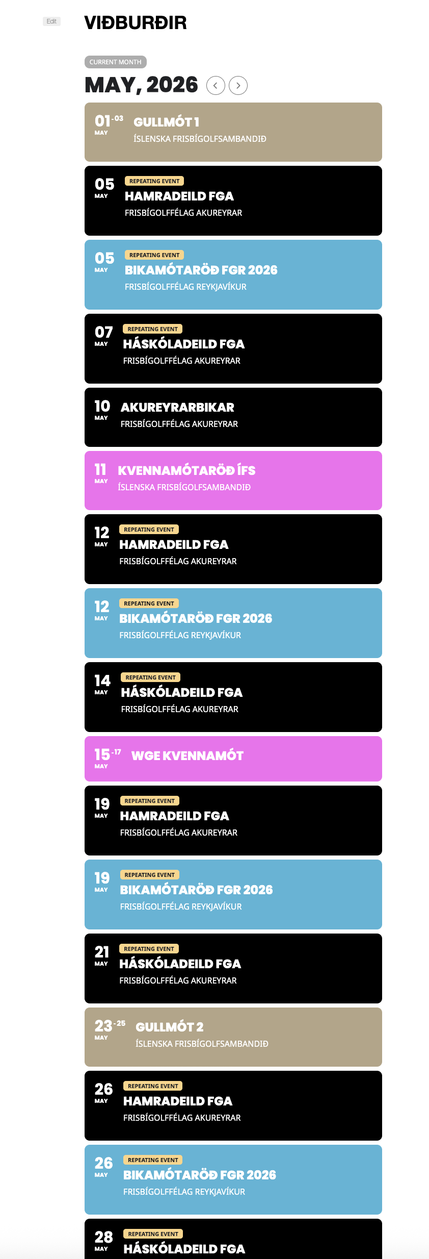 Aðalfundur Frisbígolffélags Reykjavíkur var nýlega haldinn í Geisla í Grafarholti. Góð mæting var á fundinn og skemmtilegar umræður um ýmis mál tengd starfseminni og uppbyggingu íþróttarinnar í Reykjavík.